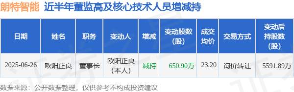 证券之星消息,根据6月27日市场公开信息、上市公司公告及交易所披露数据整理,朗特智能(300916)最新董监高及相关人员股份变动情况:2025年6月26日公司董事长欧阳正良共减持公司股份650.9万股,占公司总股本为4.5%。变动期间公司股价下跌0.77%,6月26日当日收盘报28.26元。