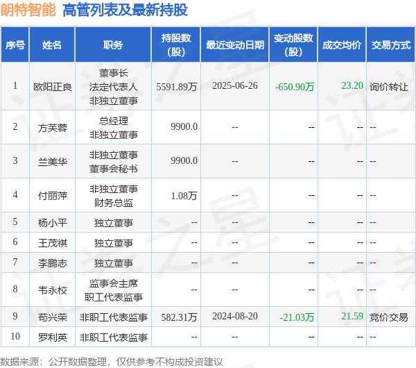 朗特智能近半年内的董监高及核心技术人员增减持详情如下: